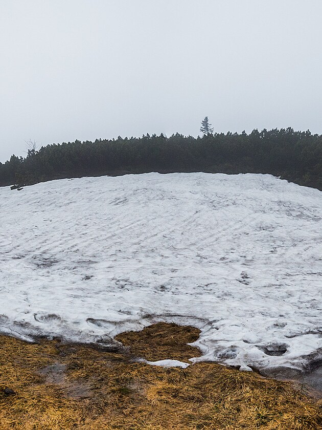 Horská bouda Výrovka v Krkonoších v mlhavém počasí (26. dubna 2018)