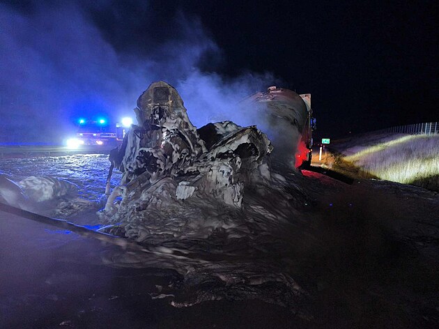 Na dálnici D11 na 102. kilometru ve směru Jaroměř zasahovali hasiči u požáru cisternového vozu převážejícího saze v práškové formě. (27. srpna 2025)