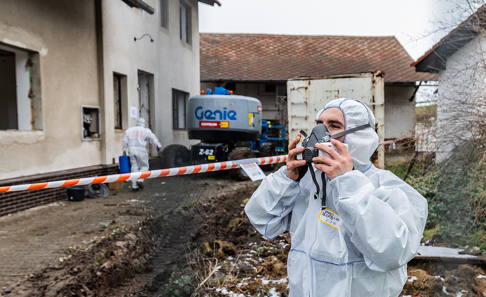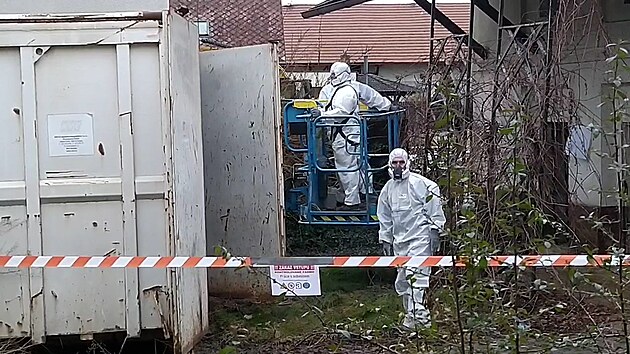 Demolice domů začala rozebíráním střech. Protože většina objektů má krytinu z eternitu, který obsahuje nebezpečná azbestová vlákna, pracuje na místě specializovaná firma. Dělníci mají ochranné obleky.
