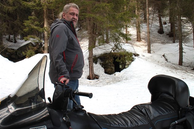 Na okraji lesa nad horskou boudou Jelení louky ukazuje Vratislav Říha na bývalou hydroelektrárnu, která připomíná starověkou hrobku. Uvnitř byla turbína a dynamo, které od roku 1936 vyhřívala vodu v bazénu.
