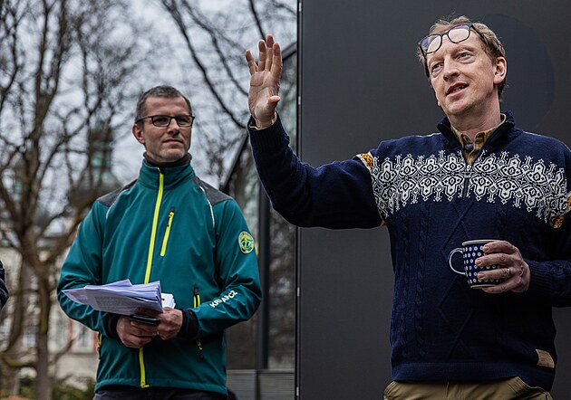 Ředitel Správy KRNAP Robin Böhnisch hovoří k demonstrantům, kteří protestují proti stavbě nové boudy v srdci Krkonoš.