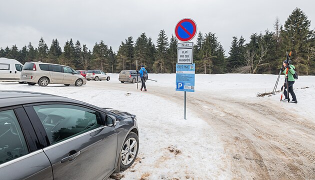 Řidiči parkují bez povolení na odlesněné ploše vedle parkoviště na Šerlichu. (22. 2. 2025).