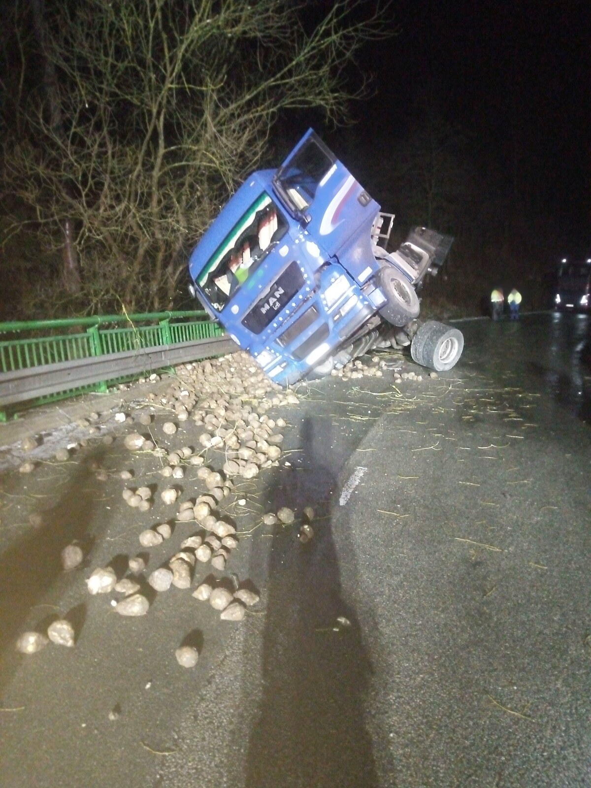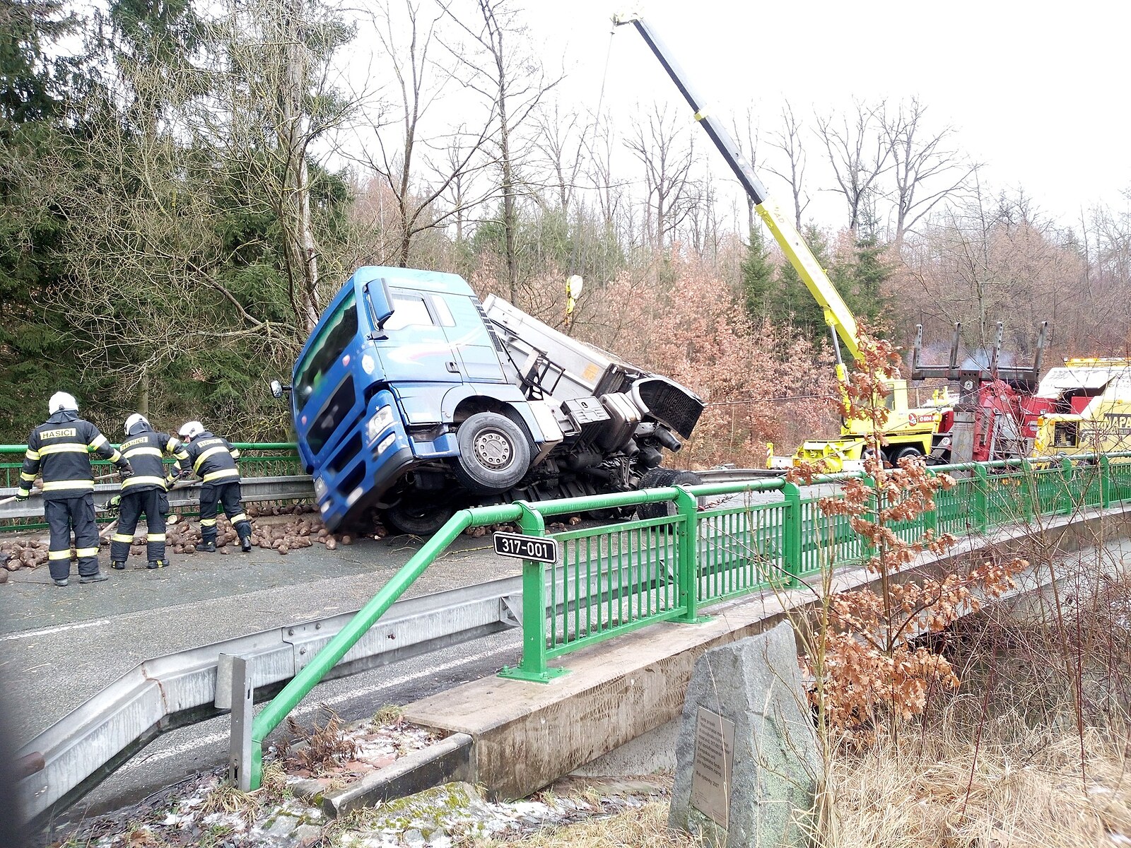 Hasiči varovali 23. ledna 2024 před namrzlými vozovkami. Ráno u Borohrádku na mostě havarovalo nákladní auto naložené řepou, odčerpávání nafty, vyproštění a úklid trval přes sedm hodin.