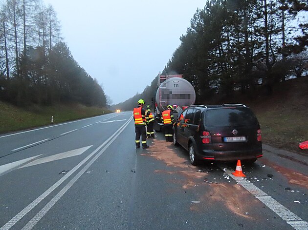 Nehoda osobního auta a cisterny s kyselinou sírovou u Náchoda (23. prosince 2024)