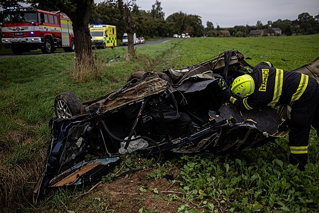Auto se při nehodě u Chvalkovic rozpáralo o strom. (22. září 2025)