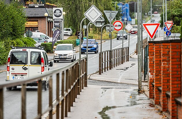 Podél výpadovky z Vrchlabí na Trutnov vede i stezka pro pěší a cyklisty, proto je tu tolik značek. (9. září 2024)