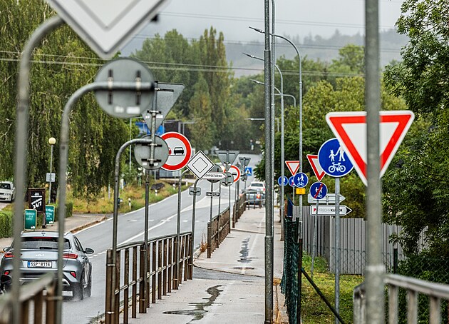 Nakupené dopravní značky podél silnice ve Vrchlabí