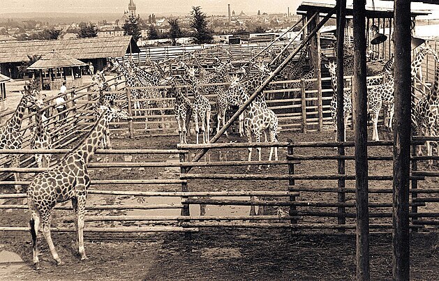 Africký kemp v zoo na snímku okolo roku 1969. Součástí bylo několik přístřešků k odpočinku návštěvníků a letní občerstvení. Dnes je na tomto místě pavilon goril a výběhy antilop.