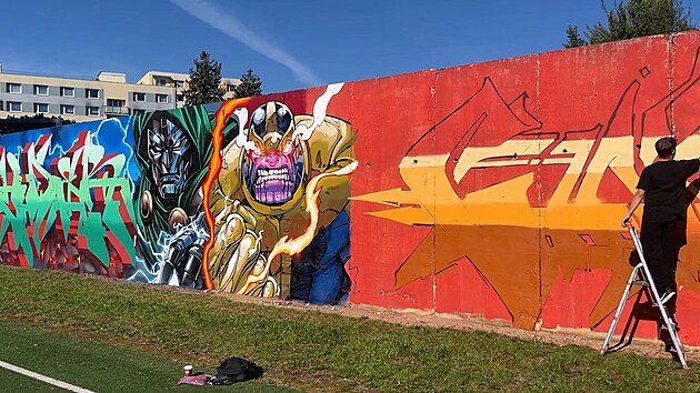 Graffiti umělci vyzdobili také sousední zeď mezi hřištěm střední školy a areálem stavební firmy, kde vzniklo kolektivní dílo autorů z Německa a Slovenska.