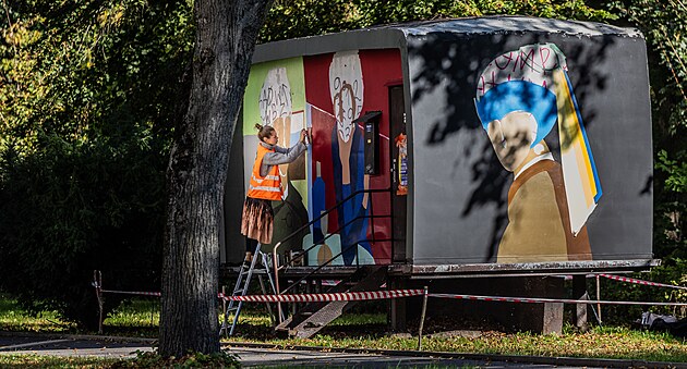 Anna Herzig-Martynenko tvoří na zdech bývalé rozvodny na Benešově nábřeží ve Dvoře Králové. (28. září 2025)