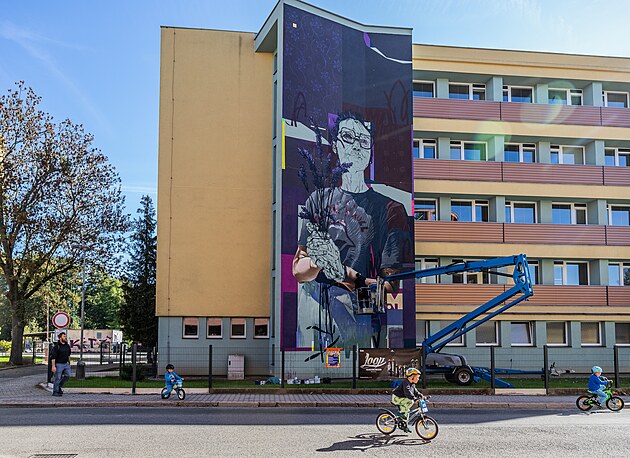 Na průmyslové škole ve Dvoře Králové Richie Mozger z Polska ztvárnil dívku s brýlemi a levandulí. (28. září 2025)