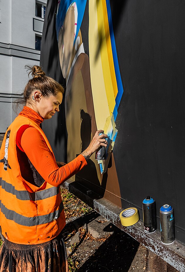 Anna Herzig-Martynenko tvoří na zdech bývalé rozvodny na Benešově nábřeží ve Dvoře Králové. (28. září 2025)