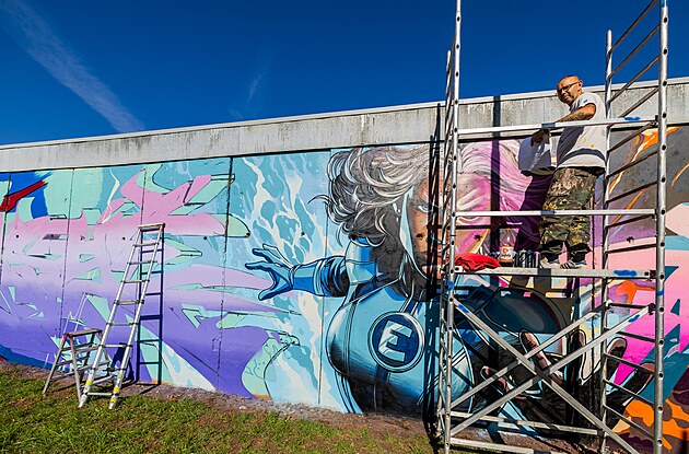 Na zdi mezi hřištěm střední školy a areálem stavební firmy ve Dvoře Králové vzniklo kolektivní dílo tvůrců z Německa a Slovenska. (28. září 2025)