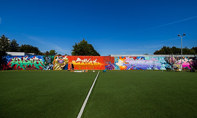 Na zdi mezi hřištěm střední školy a areálem stavební firmy ve Dvoře Králové vzniklo kolektivní dílo tvůrců z Německa a Slovenska. (28. září 2025)
