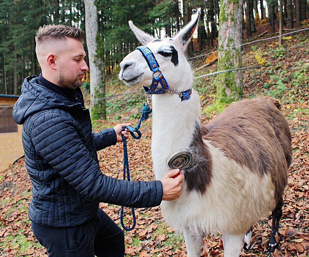 Štěpán Vlček na své farmě, kde chová velbloudy a lamy.