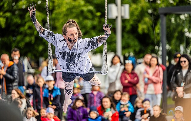 Vystoupení Elišky Brtnické Black Rain, akční malířská improvizace na festivalu Cirk-UFF (29. května 2025)