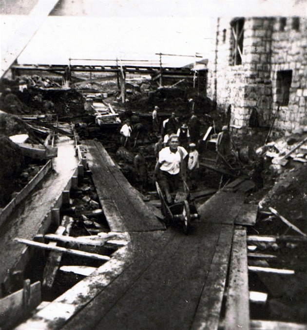 Ženy při práci na přestavbě Luční boudy po požáru roku 1938
