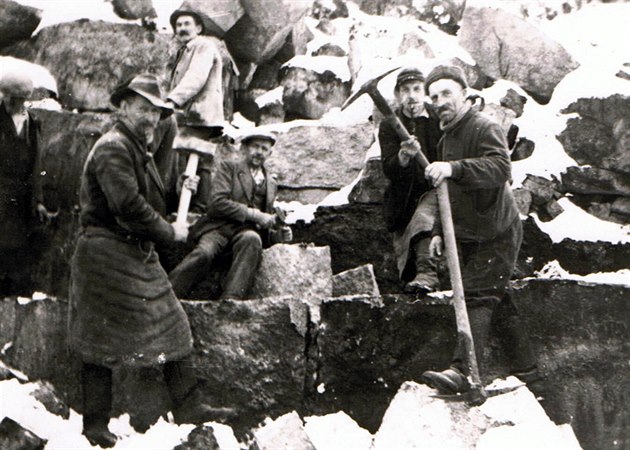Lámání kamene pro stavbu Luční boudy, která vyhořela v říjnu 1938.