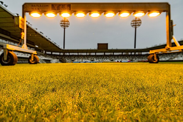 Osvětlovací rampa má pomoci trávníku, který v části hradecké arény neprospívá. (12. února 2025)