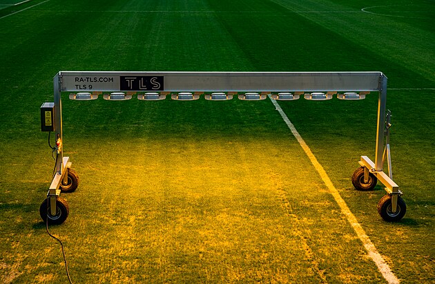 Osvětlovací rampa má pomoci trávníku, který v části hradecké arény neprospívá. (12. února 2025)