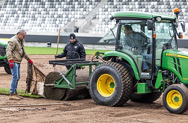 Na malšovickém stadionu začala pokládka nového trávníku dovezeného z Nizozemska. (1. března 2024)
