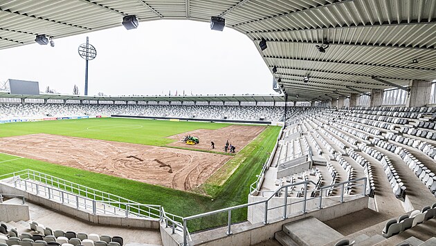 Na malšovickém stadionu začala pokládka nového trávníku dovezeného z Nizozemska. (1. března 2024)