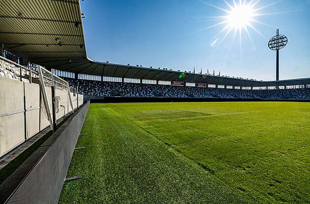 Nový trávník z Itálie položili pod jižní a západní tribunou, kde schází slunce.