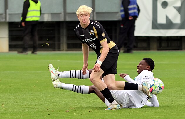 Královehradecký záložník Tom Slončík sleduje míč po souboji s karvinským obráncem Sahmkouem Camarou.