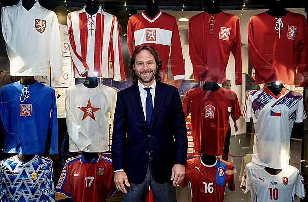 Pavel Nedvěd, nový generální manažer českých fotbalových reprezentací, pózuje v síni slávy.