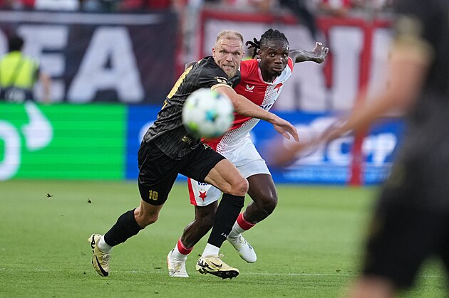 Královéhradecký Mick van Buren brání míč před slávistickým Igohem Ogbuem.
