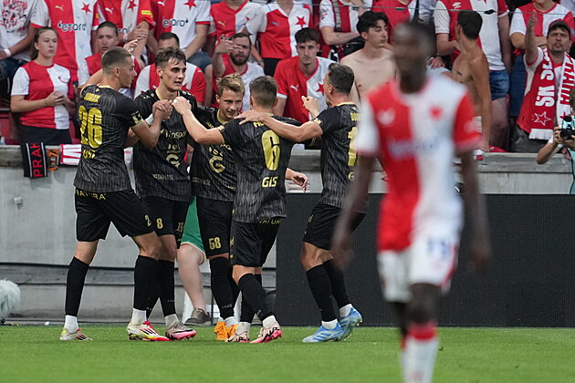Fotbalisté Hradce Králové se radují z gólu do sítě Slavie.