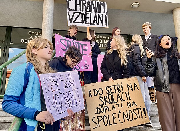 Před gymnáziem v Hostinném začal studentský protest proti záměru omezit osmiletý obor. (2. října 2025)