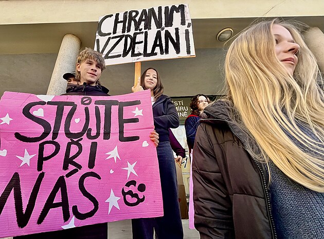 Před gymnáziem v Hostinném začal studentský protest proti rušení osmiletého oboru. (2. října 2025)