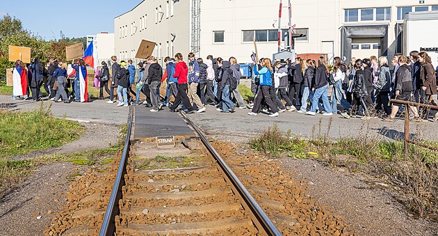 Studenti v Hostinném demonstrovali proti rušení osmiletých gymnázií. (2. října 2025)