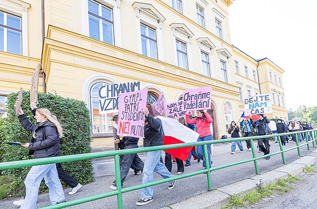 Studenti v Hostinném demonstrovali proti rušení osmiletých gymnázií. (2. října 2025)