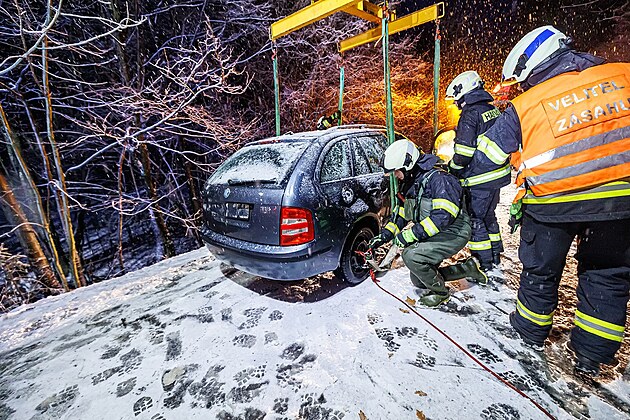 Auto v Tisu spadlo do Olešenky, hasiči ho tahali jeřábem. (2. ledna 2025)