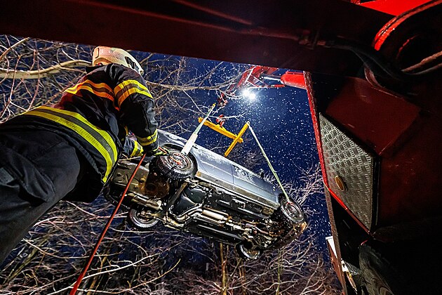 Řidička v Tisu sjela ze silnice do potoka, nic se jí nestalo. (2. ledna 2025)