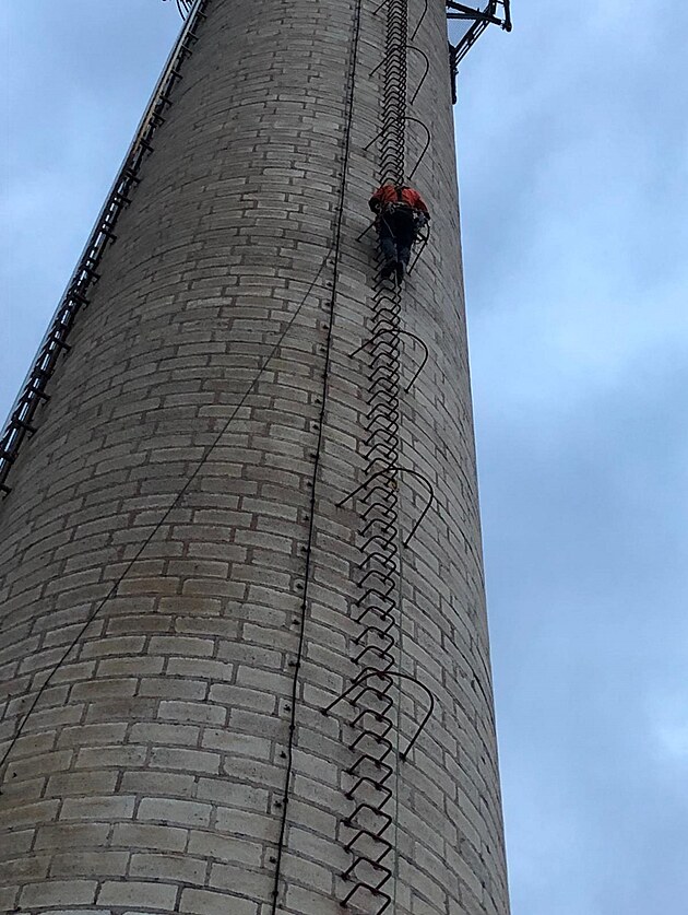 Hasič stoupá na komín hradecké nemocnice. (30. března 2025)