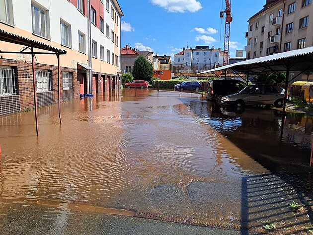 Zaplavený školní dvůr ZUŠ Střezina v Hradci Králové (22.4.2025).