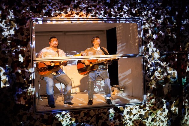Jan Sklenář jako Honza a Jan Vápeník v roli Františka v inscenaci nové hry Medvěd (19. 2. 2015).