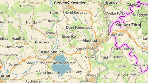 Muž začal ujíždět hlídce v Pražské ulici, pak se kolem Rubeny vrátil do centra na Mlýnskou ulici a Komenského ulicí zamířil na výpadovku I/33 směrem na Českou Skalici.