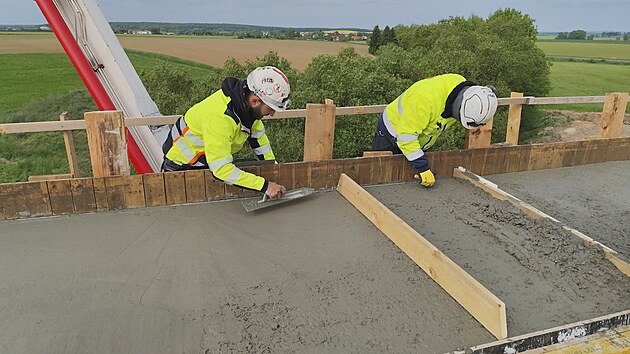 Dělníci na D35 u Hořic betonují poslední část mostovky na estakádě dlouhé 340 metrů. (6. května 2025)