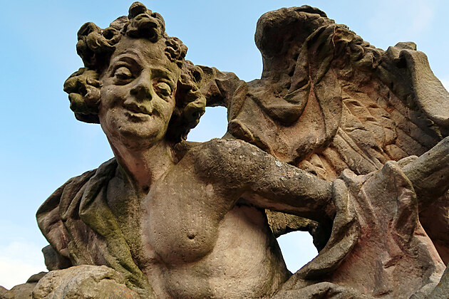 Anděl Gloria je jednou z mála soch, která vykazuje zbytky původní polychromie. Do hospitální zahrady se přesunula ve 40. leteh 19. století.