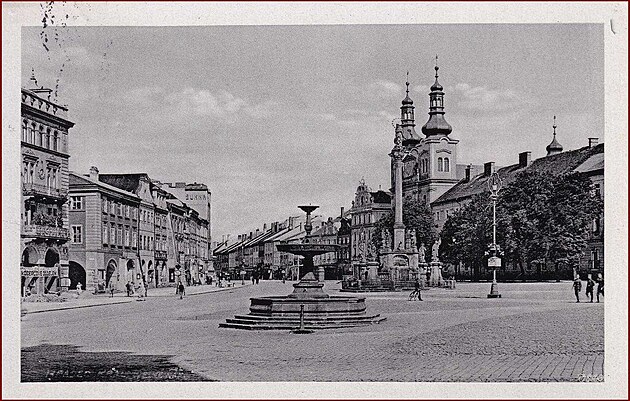 Tak vypadala kašna na hradeckém Velkém náměstí před druhou světovou válkou, stála na místě monumentální gotické kašny s bohatou sochařskou výzdobou.
