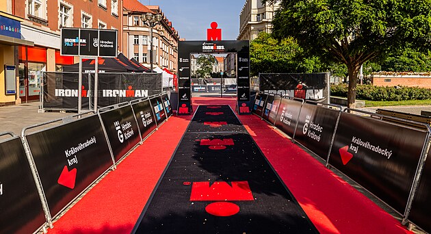 Cílový prostor na hradeckém Masarykově náměstí, kam budou dobíhat účastníci závodů Ironman. (15. srpna 2025)