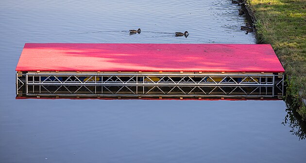 U Labe nainstalovali molo, ze kterého budou plavci skákat při startu hradeckého Ironmana. (15. srpna 2025)