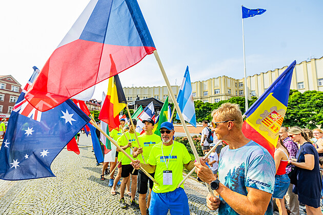 Průvod vlajek na slavnostním zahájení závodů Ironman od hradeckého Masarykova náměstí (16. srpna 2025)