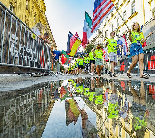 Průvod vlajek na slavnostním zahájení závodů Ironman od hradeckého Masarykova náměstí (16. srpna 2025)