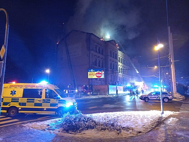Devět jednotek hasičů zasahovalo v noci na dnešek u požáru bývalé školy v Alejní ulici v Teplicích. (13. února 2025)