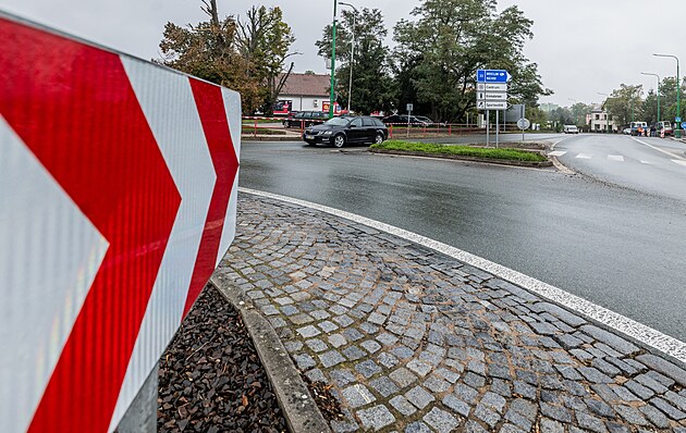 Okružní křižovatka Na Špici a sjezd směrem k centru Jaroměře (29. října 2024)